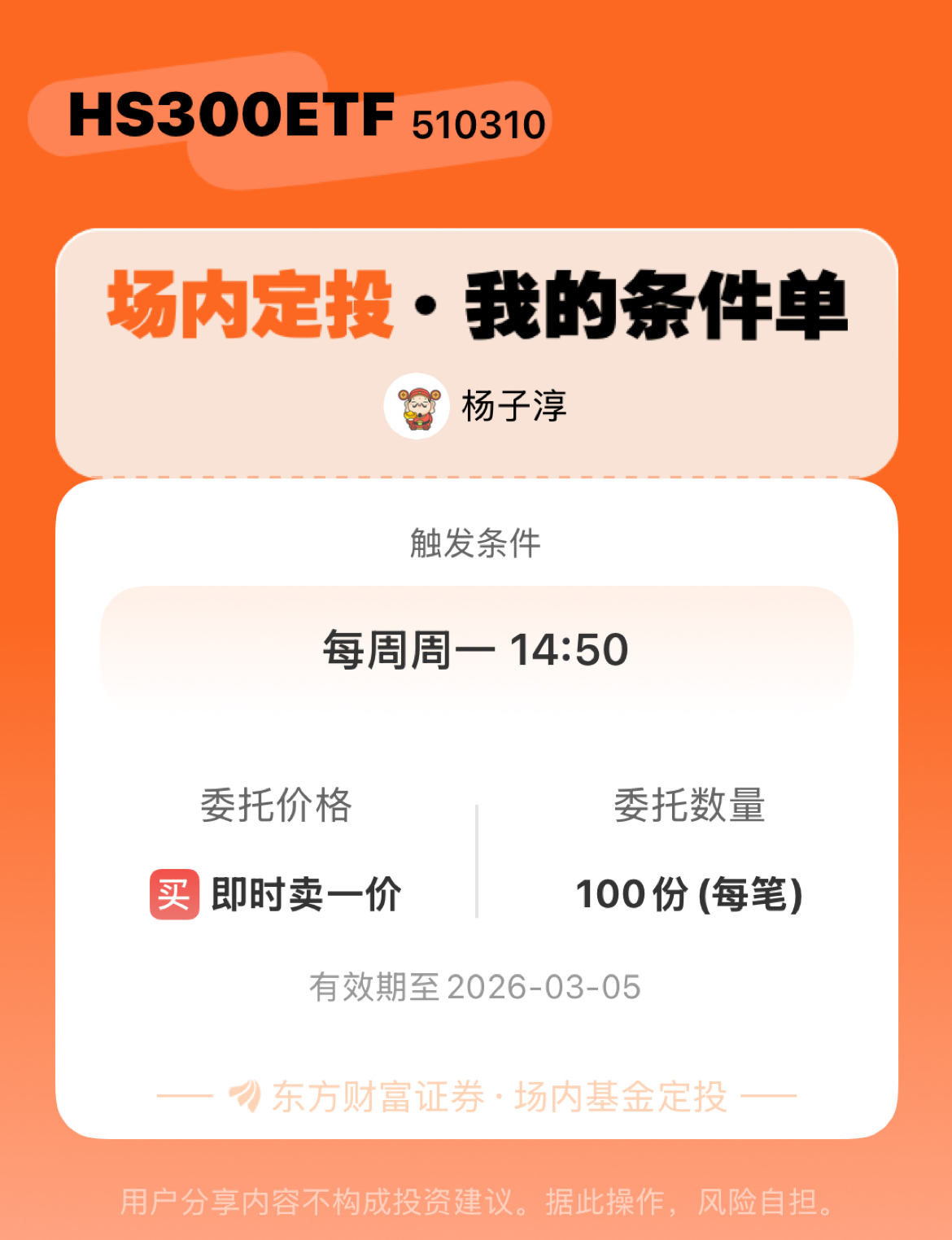 #条件单交流# #场内定投晒单# 一位股神设置了一个场内基金定投条件单,接下来就是见证奇迹的时刻~$沪深300ETF易方达(SH510310)$