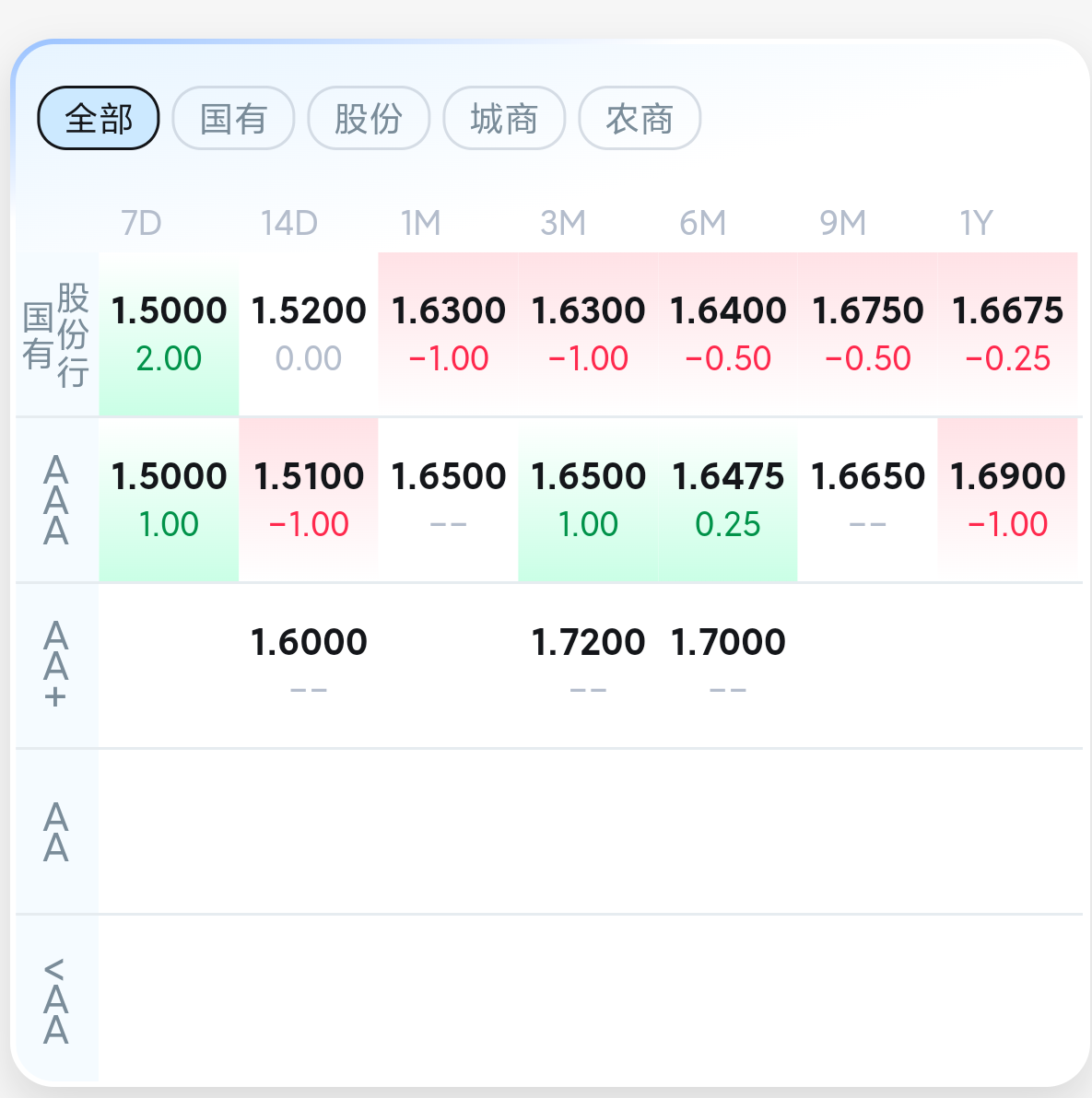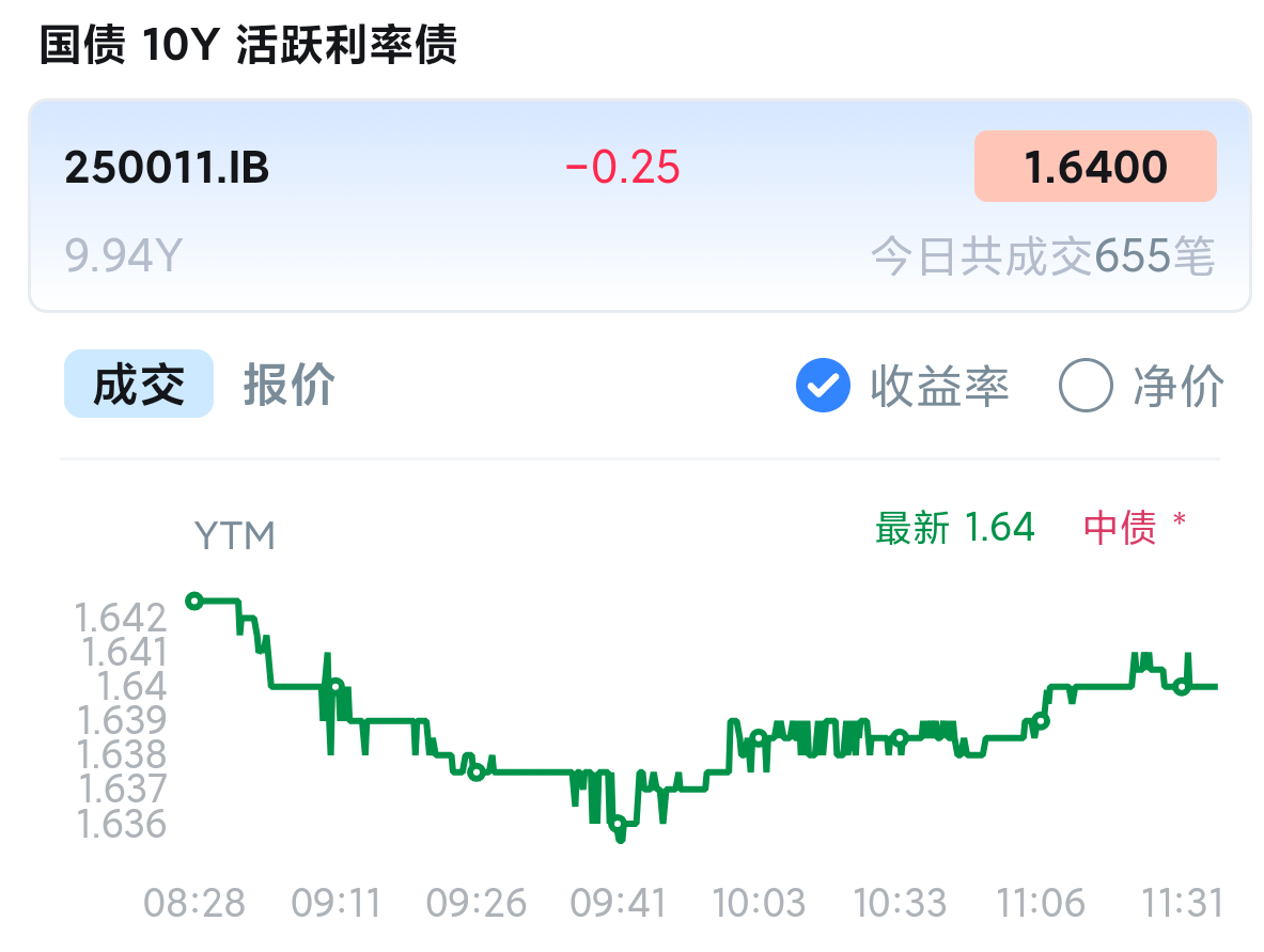 十年期国债收益率:1.64%,-0.25BP(国债收益率越跌,债市越涨)