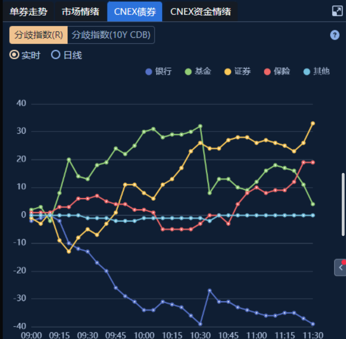 债券分歧指数显示,早间银行大力出券,券商、基金、保险积极买入。
