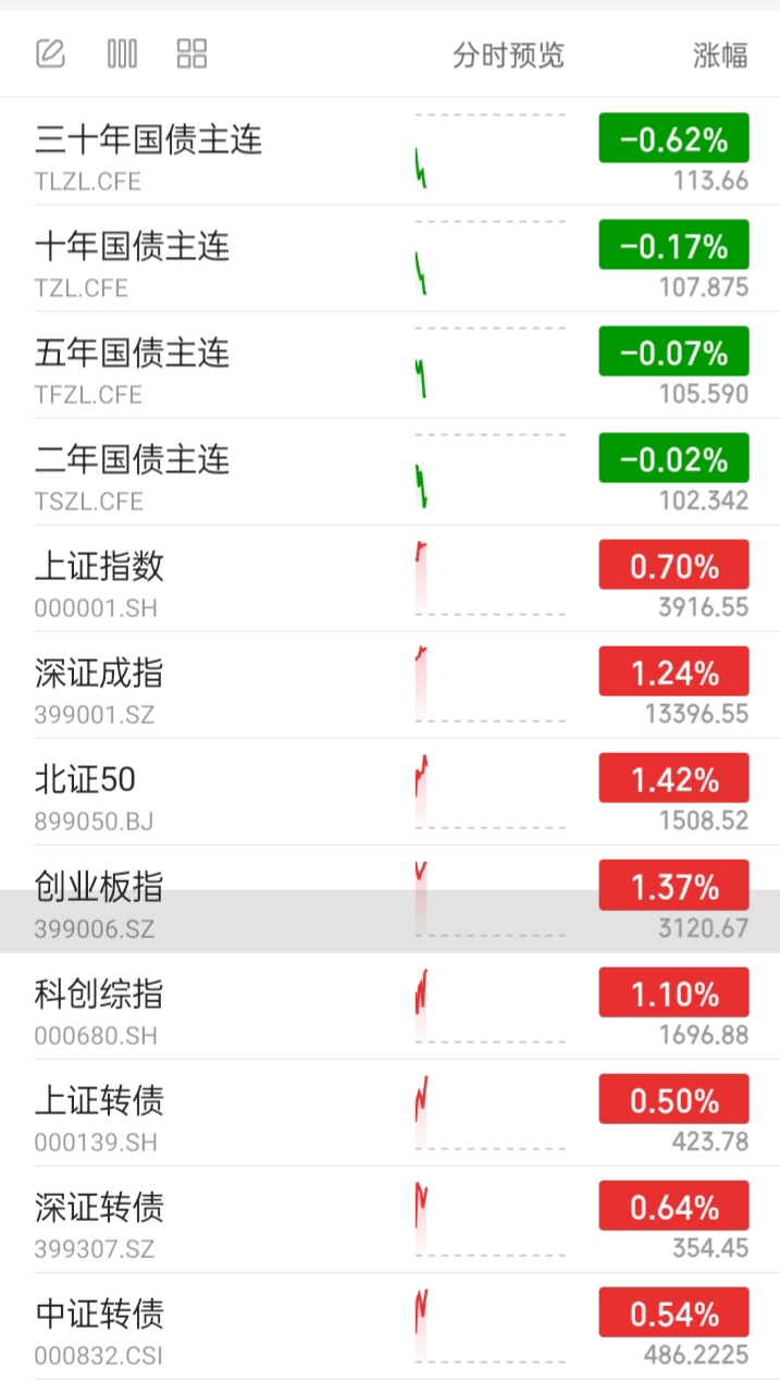 股市主要指数全部上涨,对债市有压制作用。今天偏股混合债基可能收蛋。