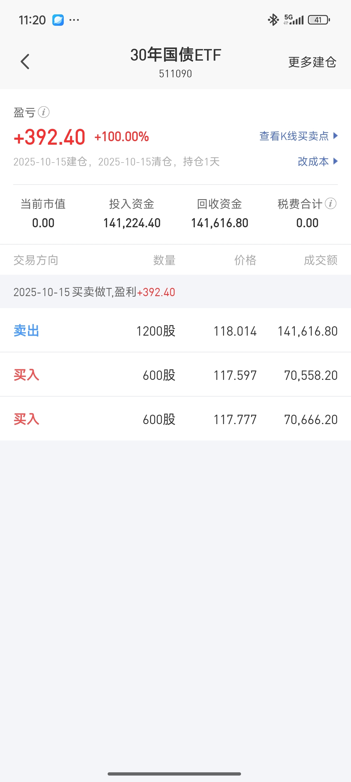$30年国债ETF(SH511090)$ 300多到手,跑了。