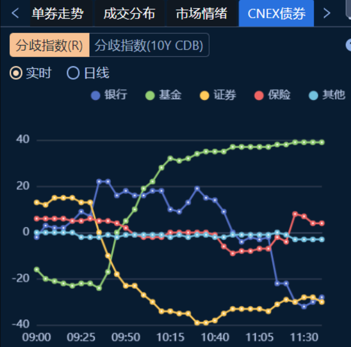 债券分歧指数显示,9:35后,基金转为买债主力,近午间,银行、证券均呈卖出趋势。