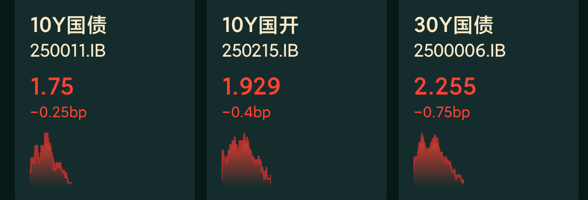 十年期国债收益率:1.75%,+0.25BP(国债收益率越跌,债市越涨)