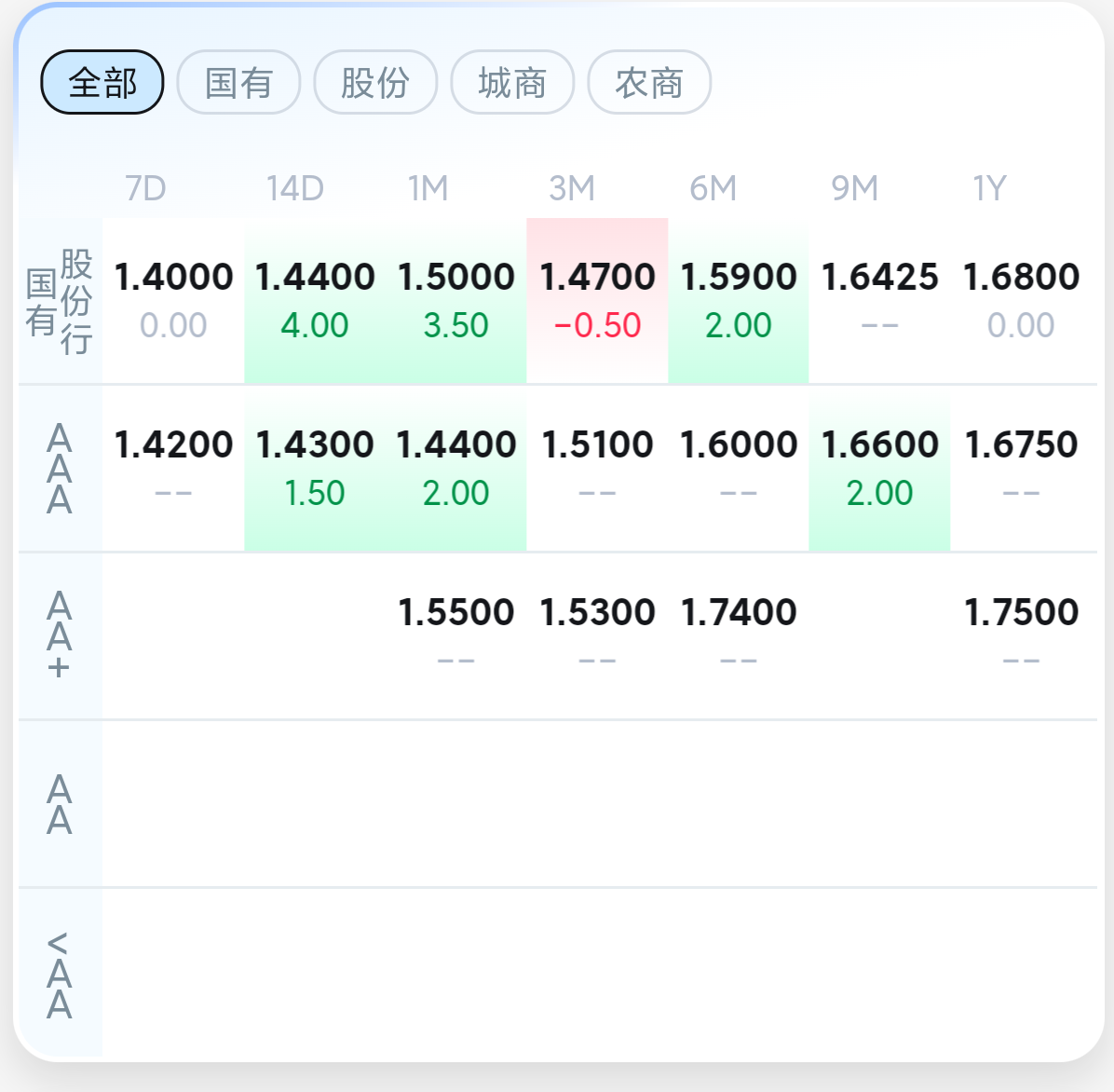 今日央妈资金面呵护流动性,市场方面延续股债跷跷板效应,9月物价降幅收窄,10年期国债活跃券收益率一度上行至1.76%,30年期国债收益率上行至2.117%。盘中随着权益端走弱,银行间中长端现券收益率逐步下行,10年期国债收益率下行至1.75%,30年期国债收益率下行至2.094%,利率债信用债存在多云,同业存单阴。