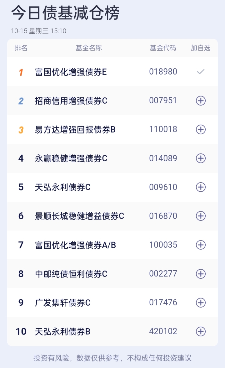 八、债券基金加、减仓榜(截止到15:00收盘)