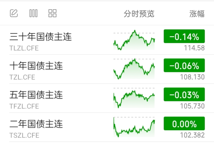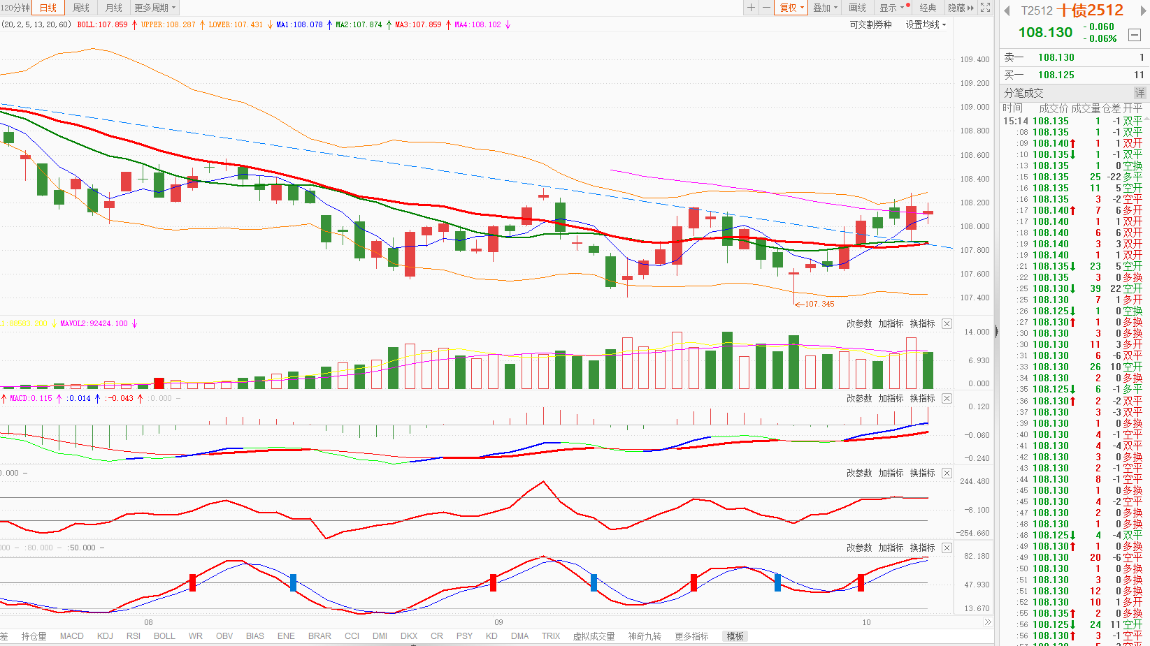 今天国债期货日K线收盘后全部在5日均线之上,整体走势震荡偏弱。