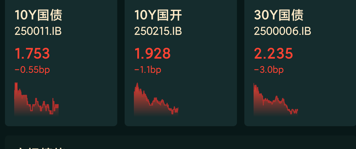 十年期国债收益率:1.753%,-0.55BP(国债收益率越跌,债市越涨)