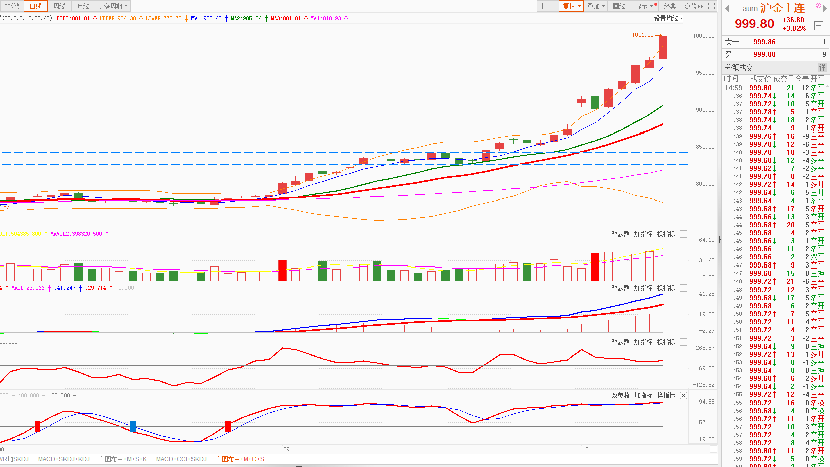 沪金主连:涨3.82%,日K线在5日均线之上。今天沪金继续大涨,日K线在布林线上轨之上,盘中突破了1000元大关。目前加速上冲,是最后的疯狂吗,也未必,正如有人说的,黄金的“疯狂上涨”预示着“更大的事情”正在发生,存在的即是合理的,我们跟随就行。