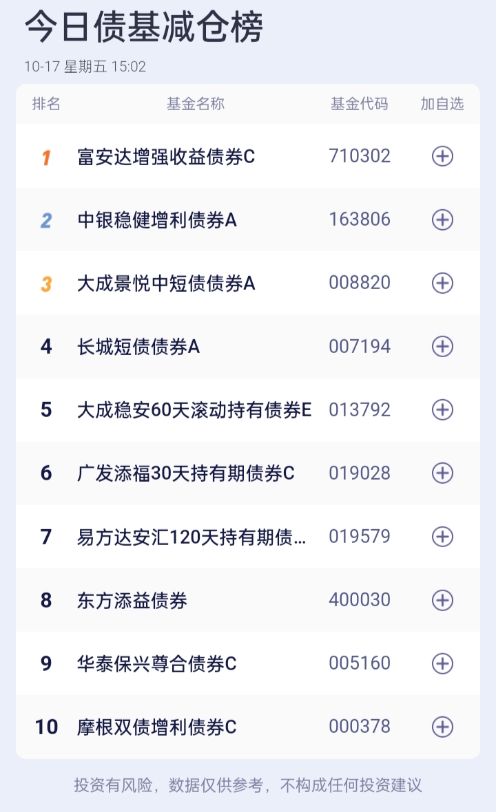 八、债券基金加、减仓榜(截止到15:00收盘)