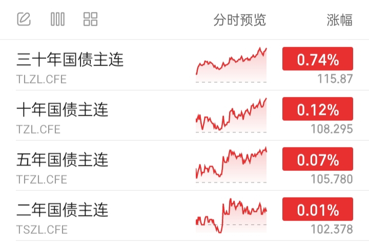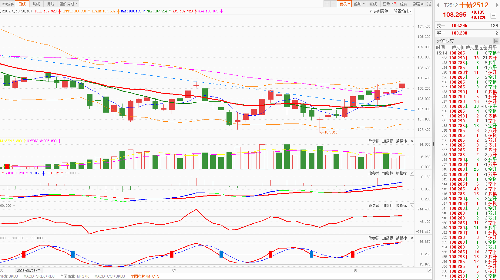 今天国债期货日K线收盘后全部在5日均线之上,整体走势较强。