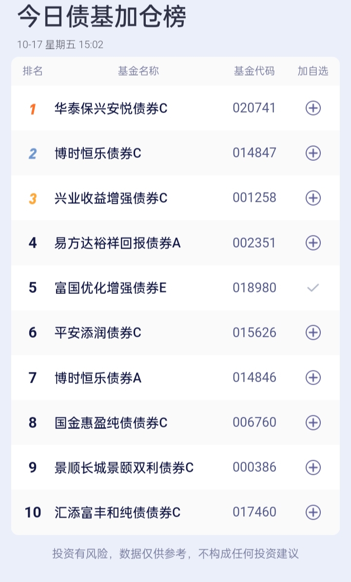 $华泰保兴安悦债券C(OTCFUND|020741)$。$南方中债7-10年国开行债券指数E(OTCFUND|013594)$。$华泰保兴安悦债券A(OTCFUND|007540)$。$永赢鑫欣混合C(OTCFUND|018603)$。$东方添益债券(OTCFUND|400030)$。$方正富邦鸿远债券C(OTCFUND|015909)$。$南方中债7-10年国开行债券指数A(OTCFUND|006961)$。$易方达增强回报债券A(OTCFUND|110017)$。$博时恒乐债券C(OTCFUND|014847)$。$国泰惠丰纯债债券A(OTCFUND|007214)$