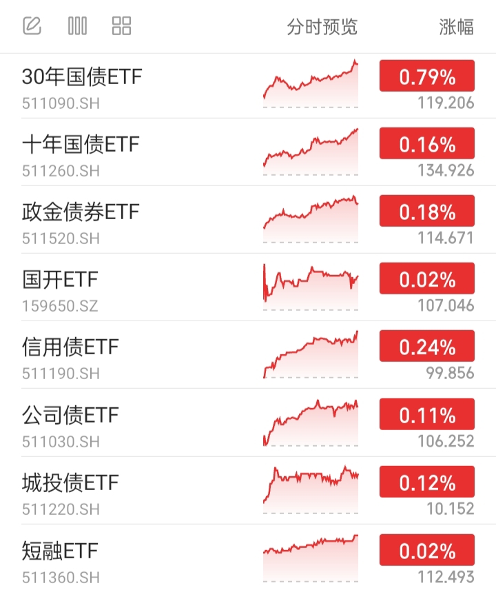 信用债ETF、公司债ETF、城投债ETF,代表信用债基。全部上涨