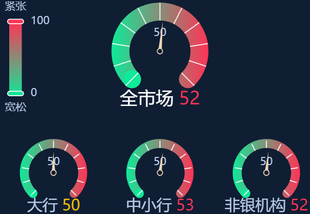 五、资金面情绪指数:全市场52 资金面紧平衡 (0-100紧张度递增,50为均衡,超过50反映资金紧张)