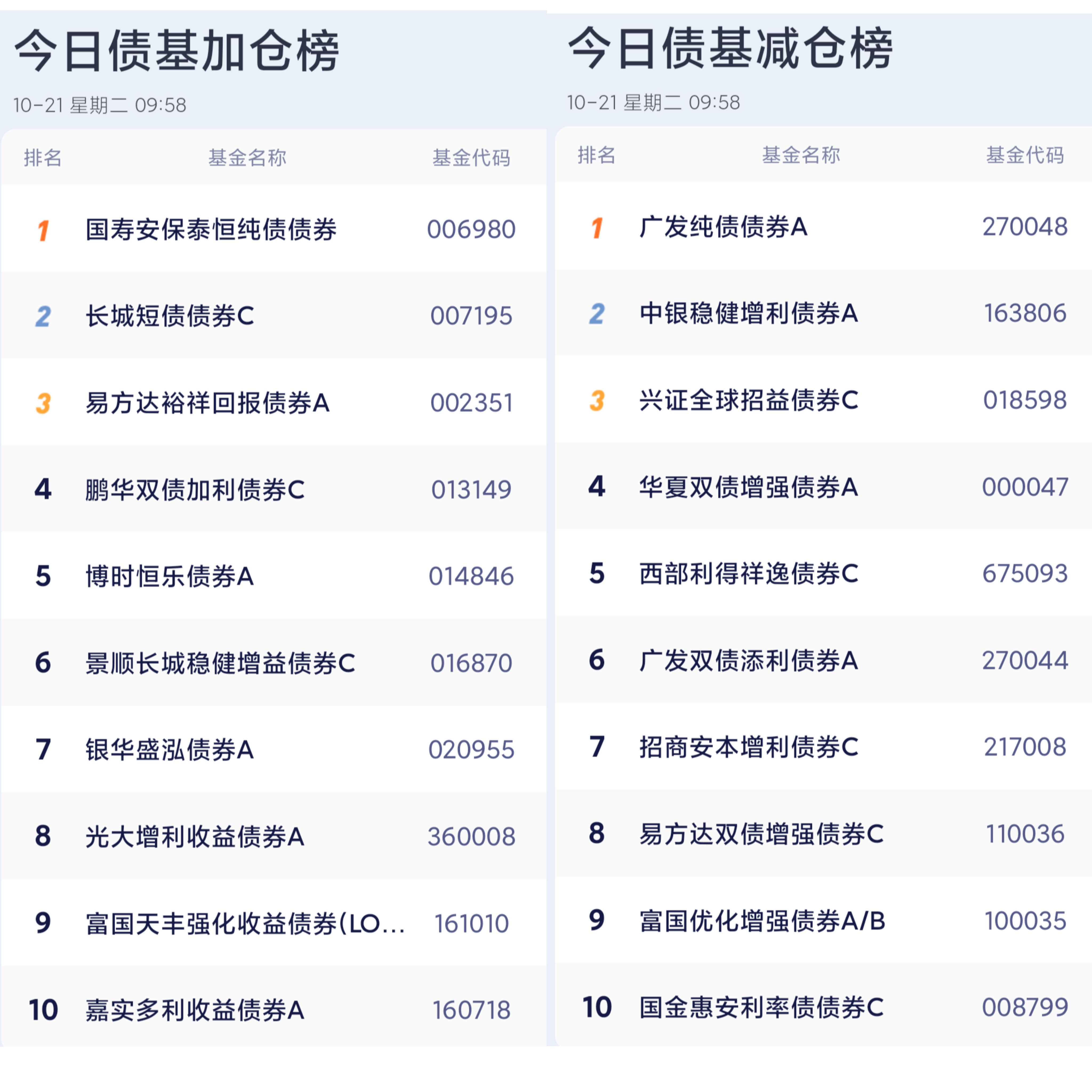 六、债券基金加减仓榜单