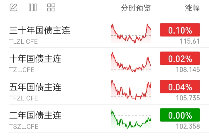 今天5、30年国债期货日K线收盘后在5日均线之上,2、10年国债期货日K线收盘后在5日均线之下,整体走势震荡偏强。
