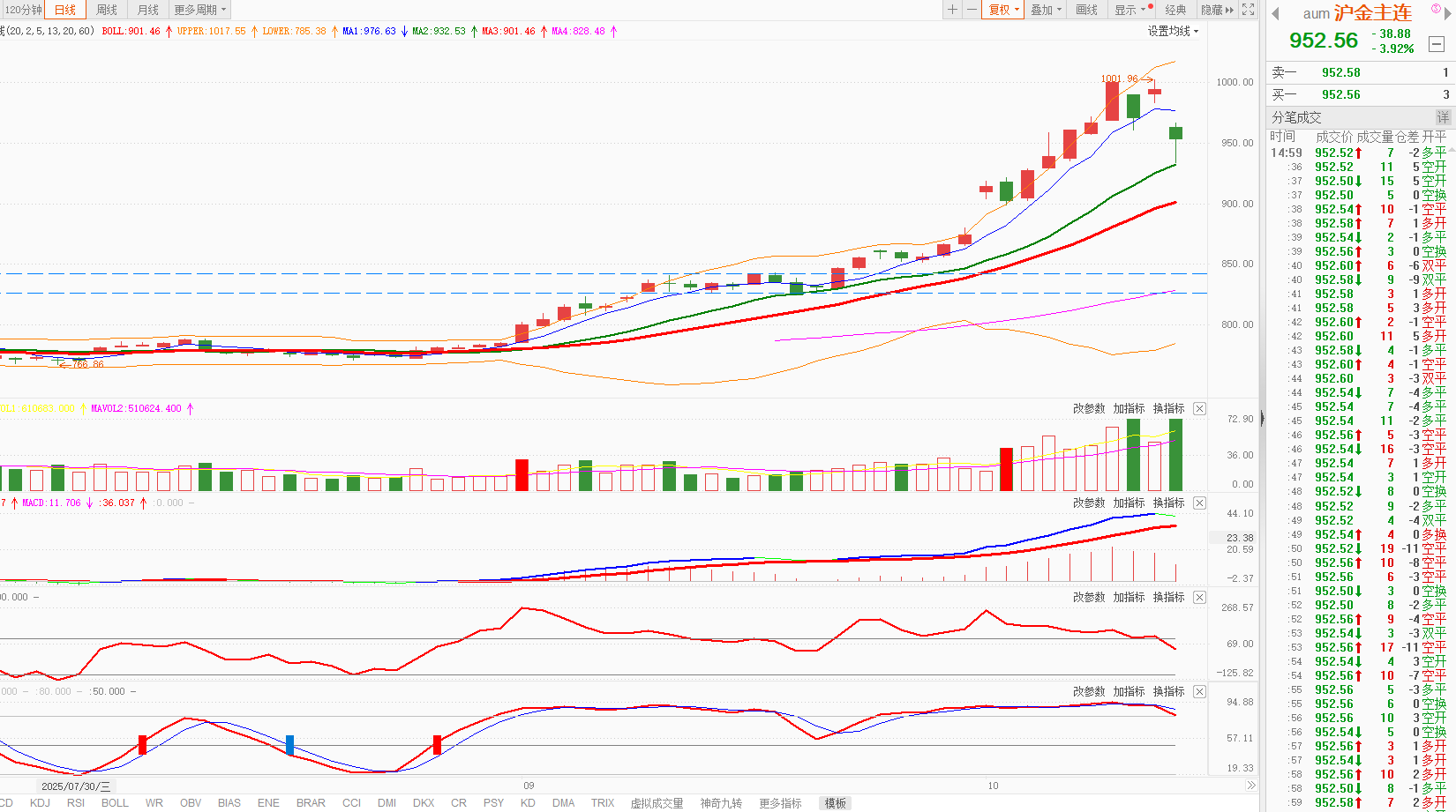 沪金主连:跌3.92%,日K线在5日均线之下。今天沪金大跌 ,日K线下探10日均线后反抽,10日均线处应有一定支撑。后市看能否在此稳住,继续观察。
