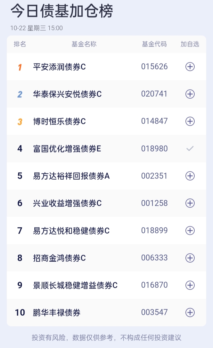 $华泰保兴安悦债券C(OTCFUND|020741)$。$南方中债7-10年国开行债券指数E(OTCFUND|013594)$。$华泰保兴安悦债券A(OTCFUND|007540)$。$永赢鑫欣混合C(OTCFUND|018603)$。$东方添益债券(OTCFUND|400030)$。$方正富邦鸿远债券C(OTCFUND|015909)$。$南方中债7-10年国开行债券指数A(OTCFUND|006961)$。$易方达增强回报债券A(OTCFUND|110017)$。$博时恒乐债券C(OTCFUND|014847)$。$国泰惠丰纯债债券A(OTCFUND|007214)$