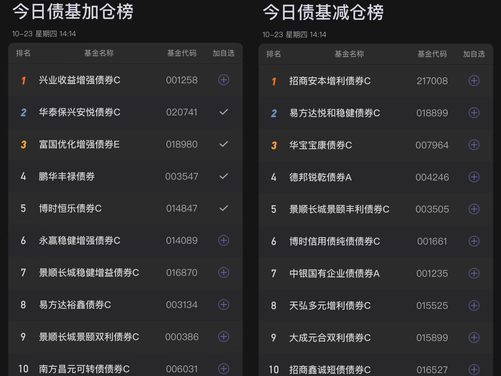 截止14点25分,华子碎11个,南方中债收1个,方正富邦鸿远碎15个,富国优化增强收个25-35个,中邮恒利碎5-15个,博时恒乐碎5-个,最终数据已17点收盘为准。