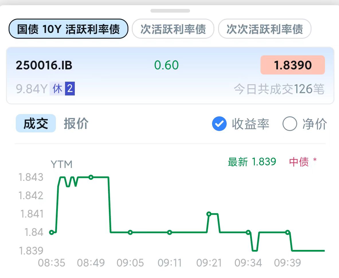 十年期国债收益率:1.839%,-0.6BP(国债收益率越跌,债市越涨)