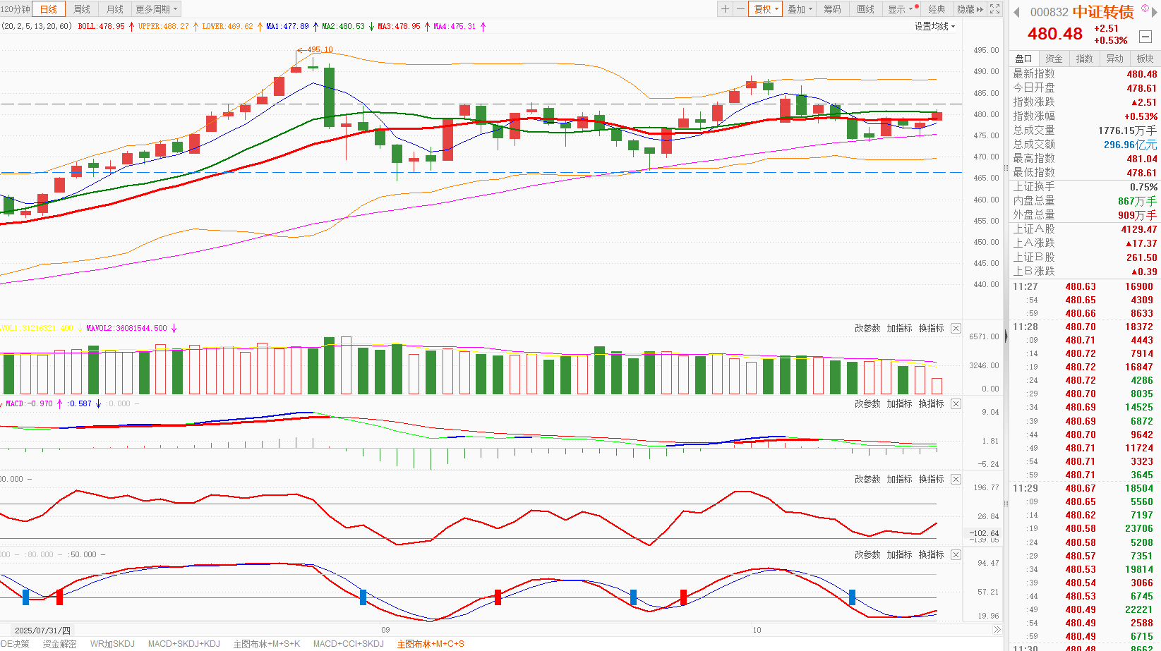 中证转债:涨0.53%,日K线在5日均线之上,KDJ金叉,MACD死叉绿柱缩短。今天中证转债上涨,日K线站上20日均线,昨天日K线探低60日均线后反弹,今天继续上涨,说明司机前天说60日均线有一定支撑是对的,今天又站上了20日均线,KDJ也是金叉,反弹还在途中,后市可能继续震荡上行。