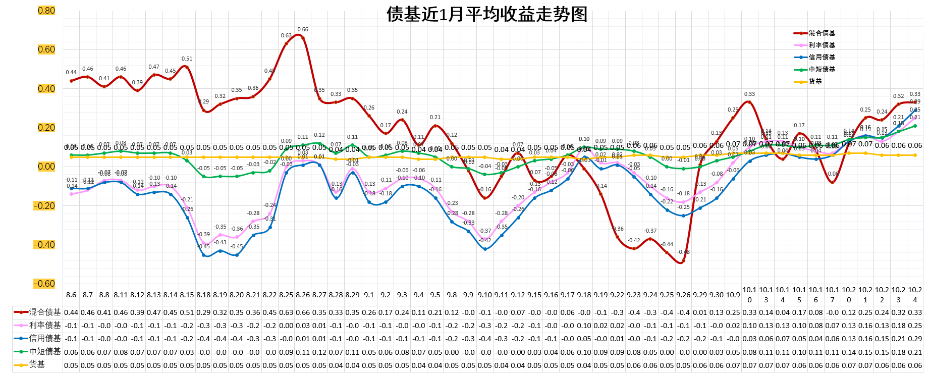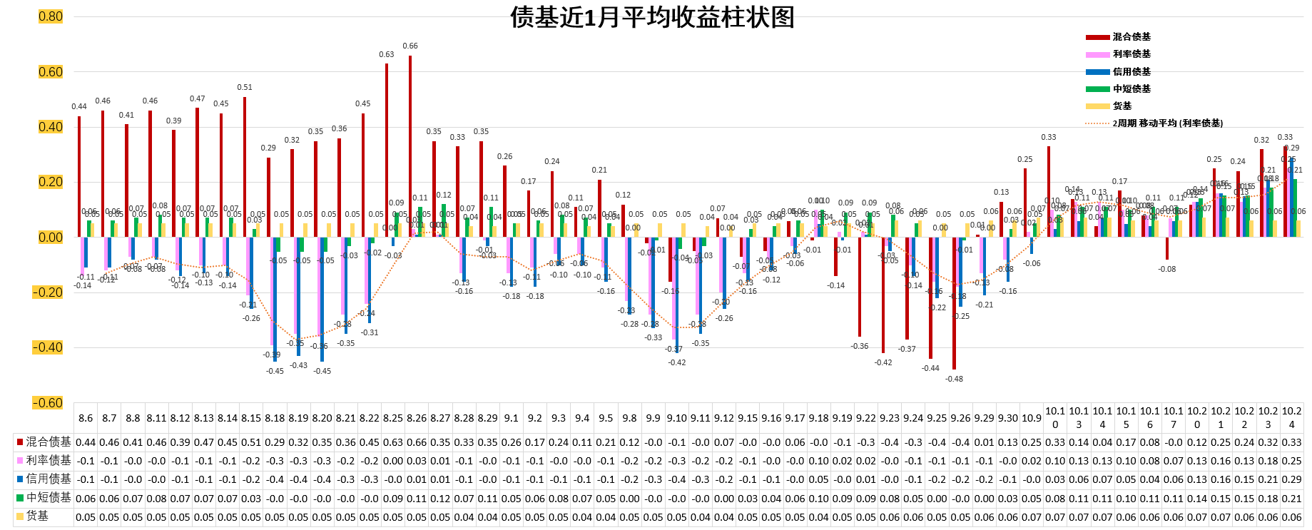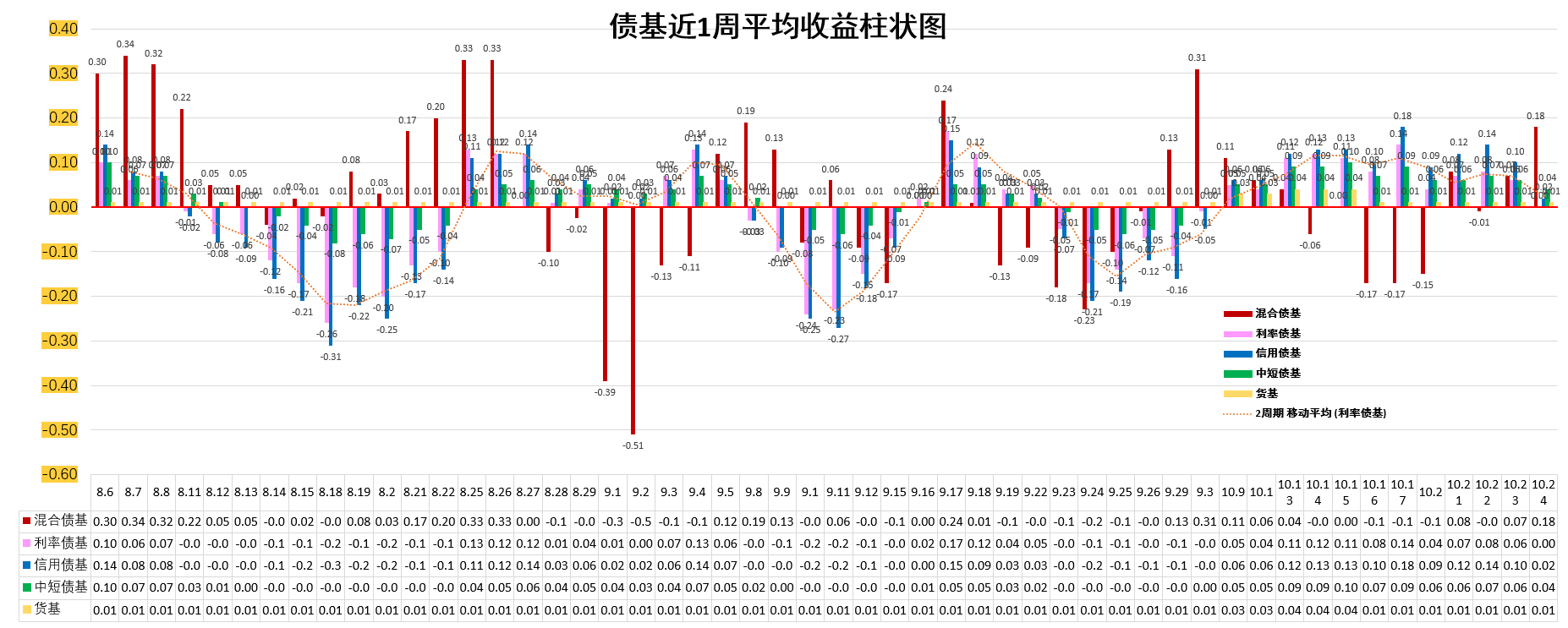 3、近1周平均收益排序:混合债基>中短债基>信用债基>货基>利率债基。