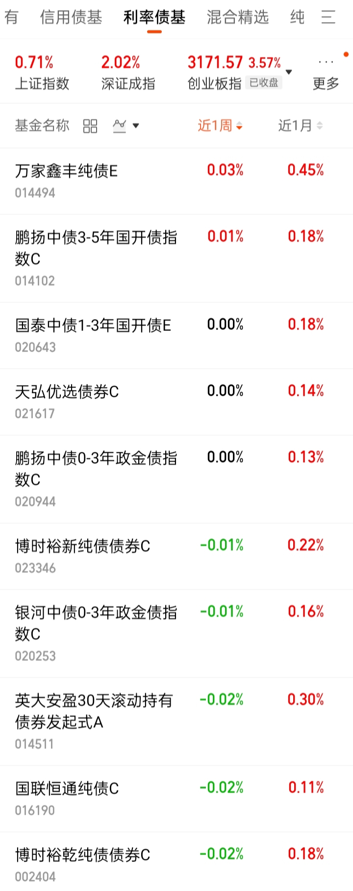 6、债基近1周平均收益为0.04%至0.00%,位于低位区。债基近1月平均收益为0.29%至0.21%,位于中位区。