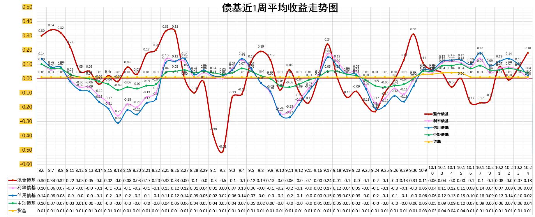 2、混合债基近1周平均收益高于货基,高于债基。利率债基近1周平均收益低于信用债基。