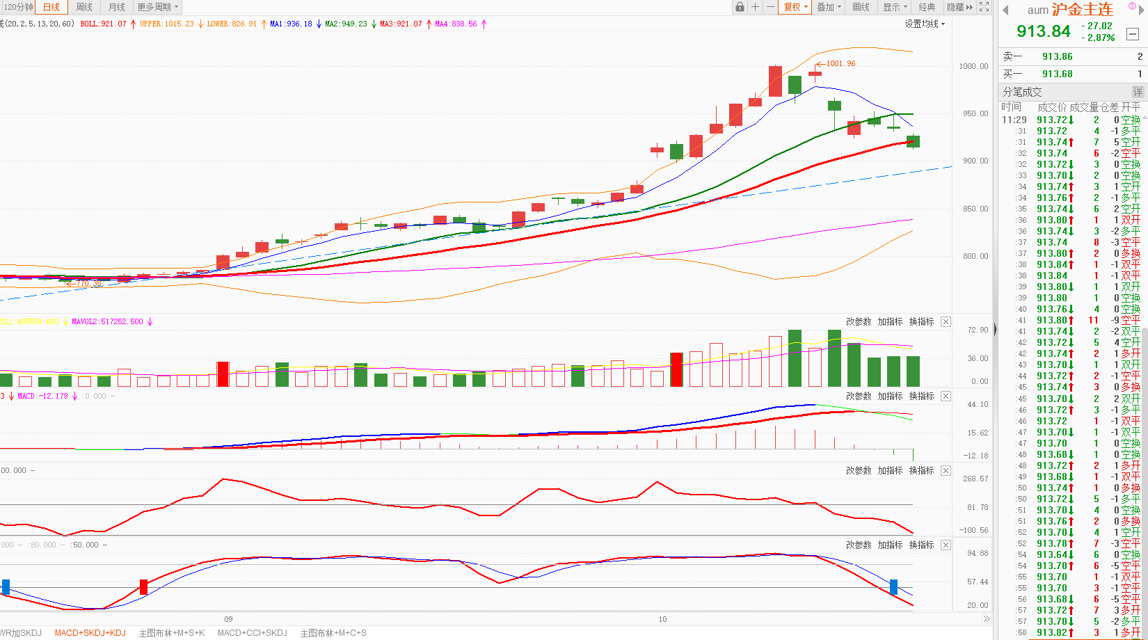 沪金主连:跌2.87%,日K线在5日均线之下。今天沪金大跌 ,日K线跌破20日均线,并破3天前新低,目前看还没有止跌迹象,但技术指标快接近低位,随时可能出现技术性反弹,今天先不动,继续观察。