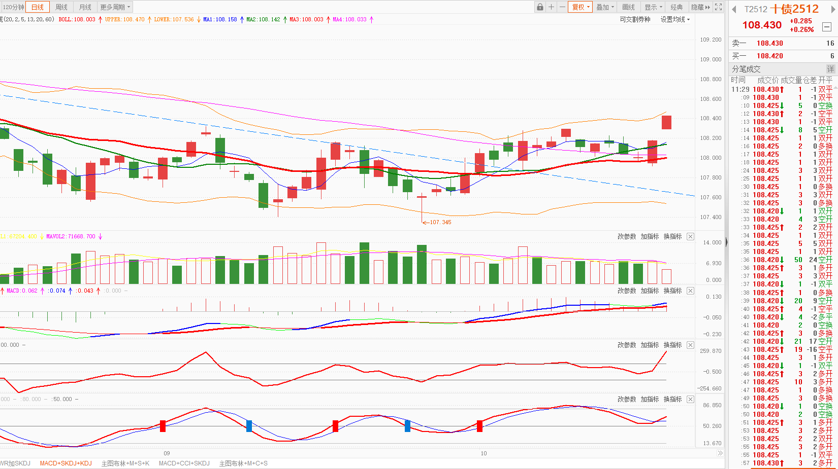 今天国债期货日K线收盘后全部在5日均线之上,整体高开高走,走势较强。
