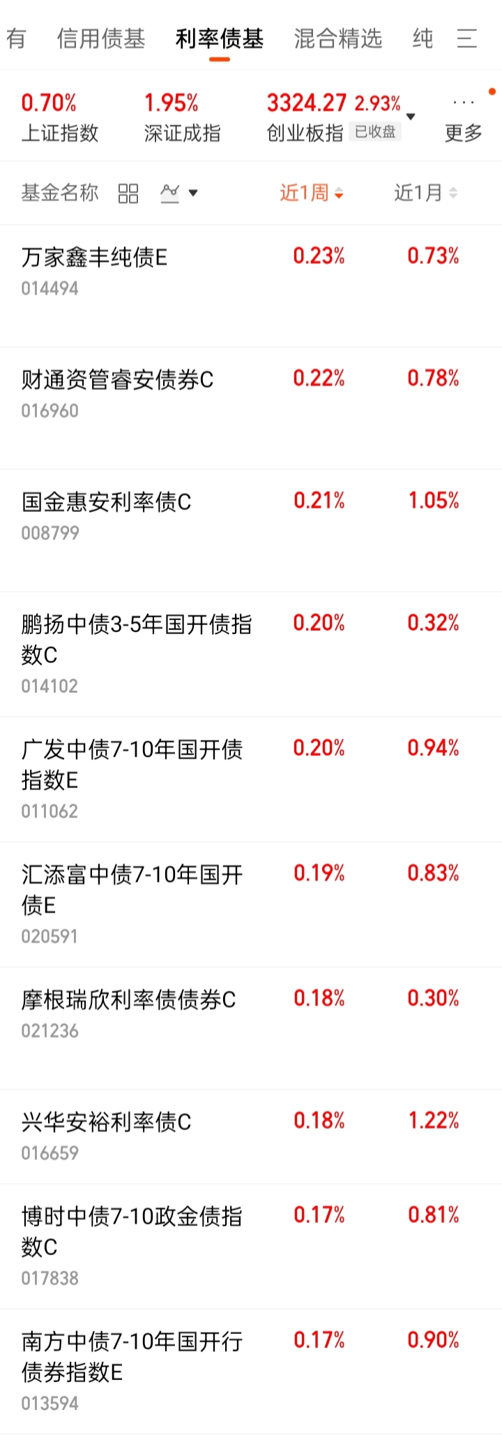 $华泰保兴安悦债券C(OTCFUND|020741)$ 。 $东方添益债券(OTCFUND|400030)$ 。 $华泰保兴安悦债券A(OTCFUND|007540)$ 。 $鹏华丰禄债券(OTCFUND|003547)$ 。 $方正富邦鸿远债券C(OTCFUND|015909)$ 。$永赢稳健增强债券C(OTCFUND|014089)$ 。 $国泰惠丰纯债债券A(OTCFUND|007214)$ 。 $博时恒乐债券C(OTCFUND|014847)$ 。 $易方达增强回报债券A(OTCFUND|110017)$ 。 $南方中债7-10年国开行债券指数E(OTCFUND|013594)$