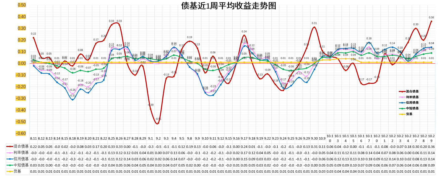 3、近1周平均收益排序:混合债基>信用债基=利率债基>中短债基>货基。