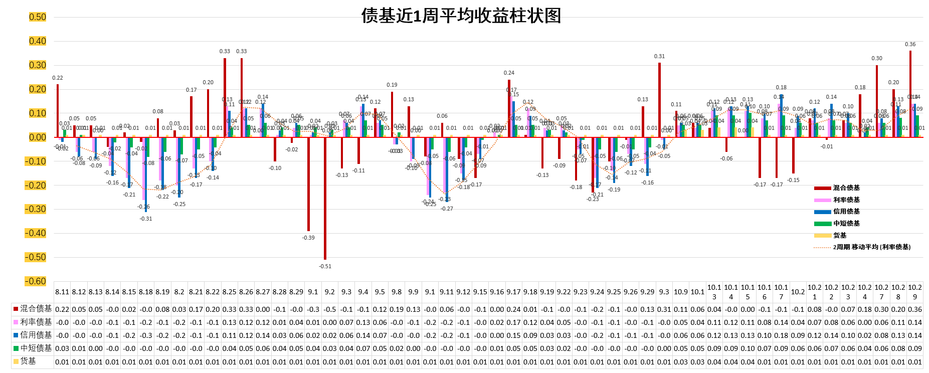 2、混合债基近1周平均收益高于货基,高于债基。利率债基近1周平均收益与信用债基持平。