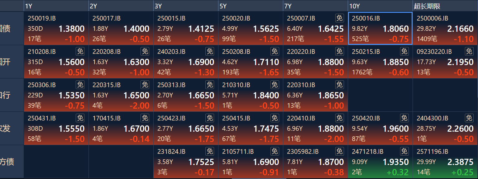 二、十年期国债收益率:1.806 -0.0075%(国债收益率越涨,债市越跌,两者反向关系)