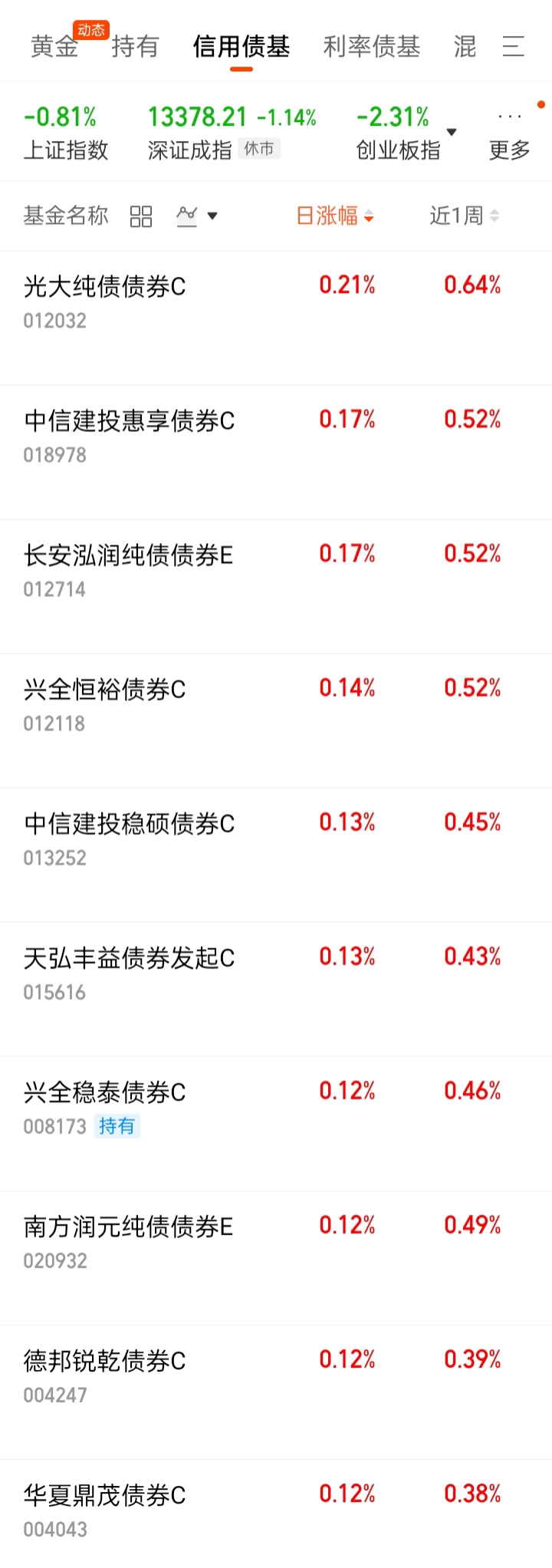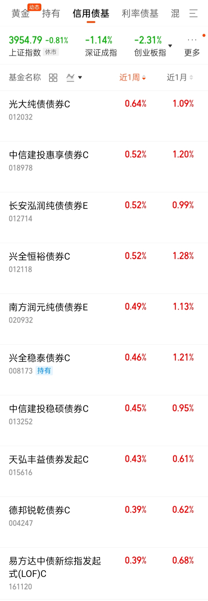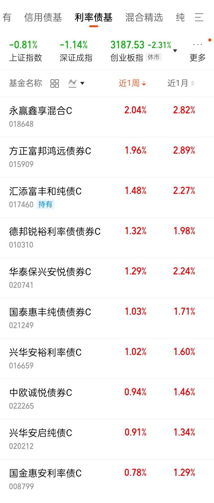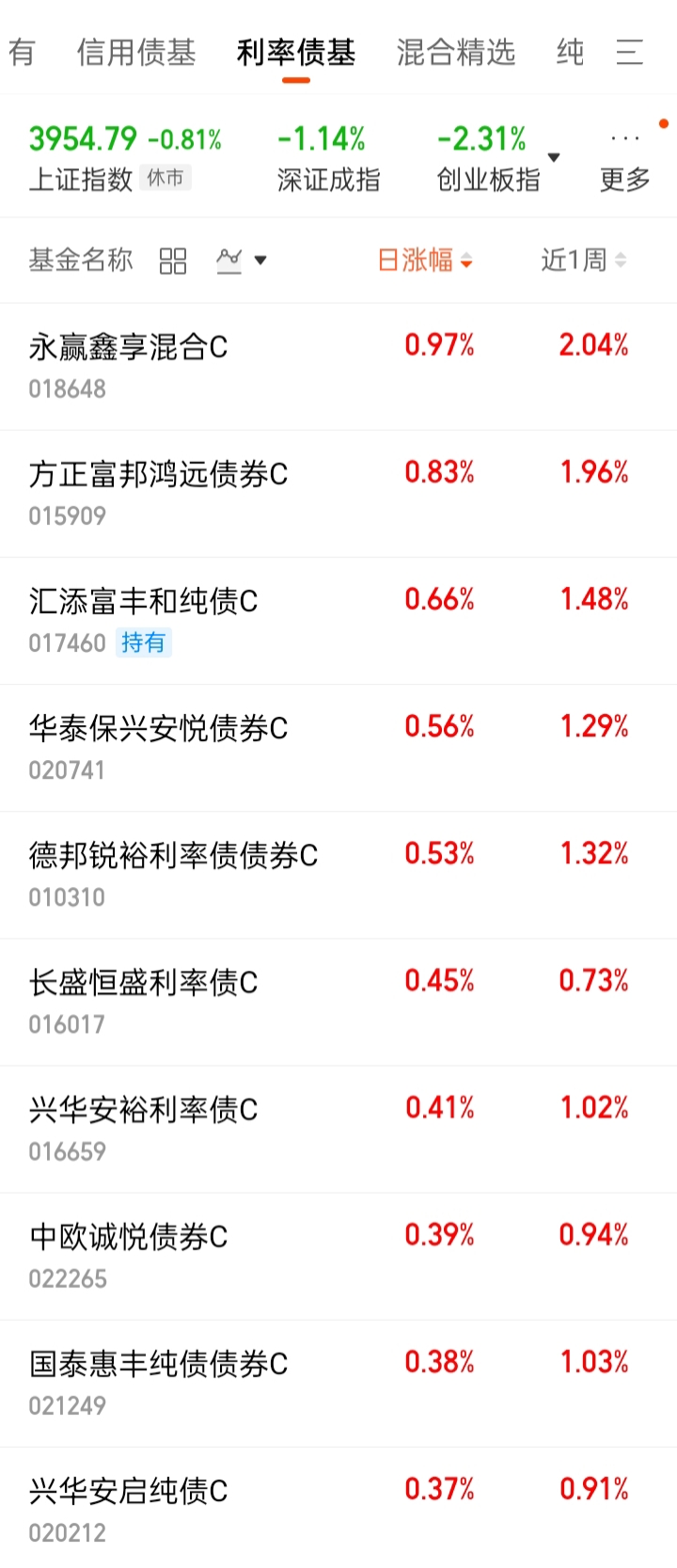 $华泰保兴安悦债券C(OTCFUND|020741)$。$东方添益债券(OTCFUND|400030)$。$华泰保兴安悦债券A(OTCFUND|007540)$ 。$鹏华丰禄债券(OTCFUND|003547)$。$方正富邦鸿远债券C(OTCFUND|015909)$。$永赢稳健增强债券C(OTCFUND|014089)$。$国泰惠丰纯债债券A(OTCFUND|007214)$。$博时恒乐债券C(OTCFUND|014847)$。$易方达增强回报债券A(OTCFUND|110017)$。$南方中债7-10年国开行债券指数E(OTCFUND|013594)$
