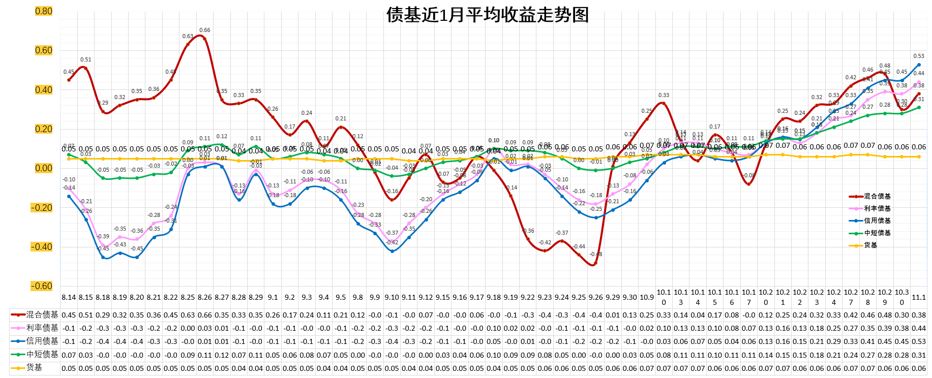 5、债基近1 周平均收益与前一天相比大幅上升。 债基近1 月平均收益与前一天相比大幅上升。混合债基近1周平均收益与前一天相比小幅上升。
