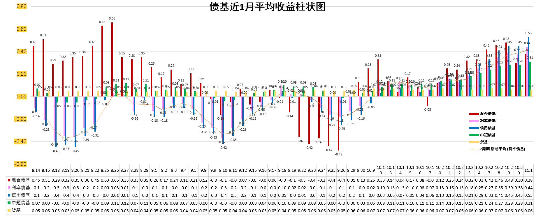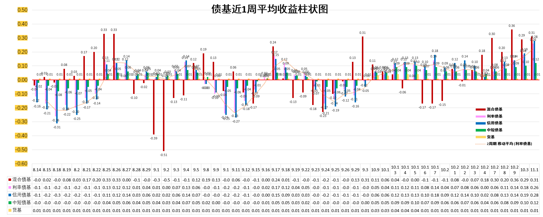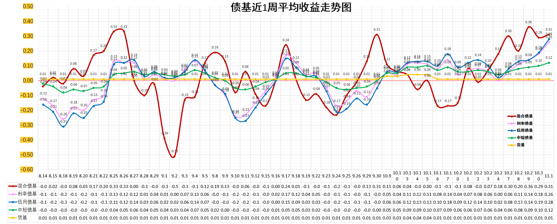 2、混合债基近1周平均收益高于货基,高于债基。利率债基近1周平均收益低于信用债基。