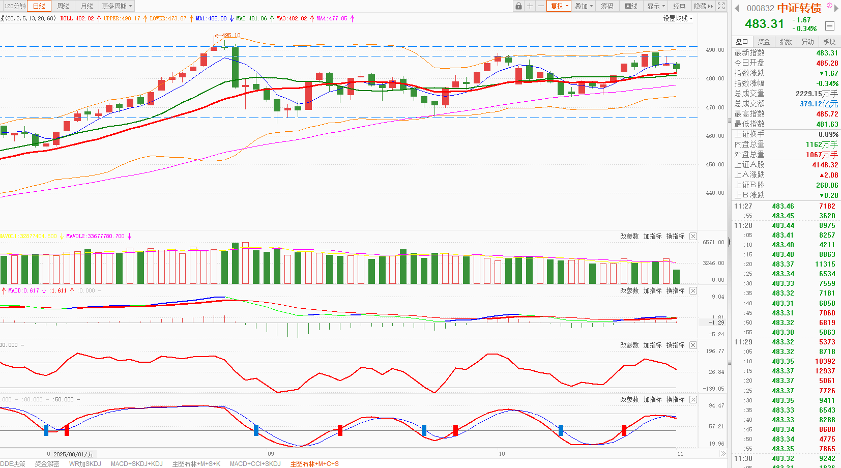 中证转债:跌0.34%,日K线在5日均线之下,KDJ死叉,MACD金叉红柱缩短。今天中证转债下跌,日K线小幅高开后低走,探低20日均线后小幅回升,目前处于区间震荡走势,后市可能向下继续震荡。