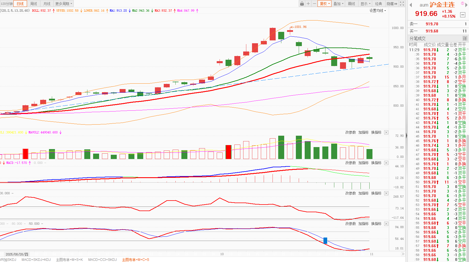 沪金主连:涨0.15%,日K线在5日均线之上。今天沪金小幅上涨,日K线探低5日均线后回升,目前仍为大幅下跌后的反弹,由于力度反弹不大,后市能否持续,仍需继续观察。持基观望或适量仓位高抛低吸。