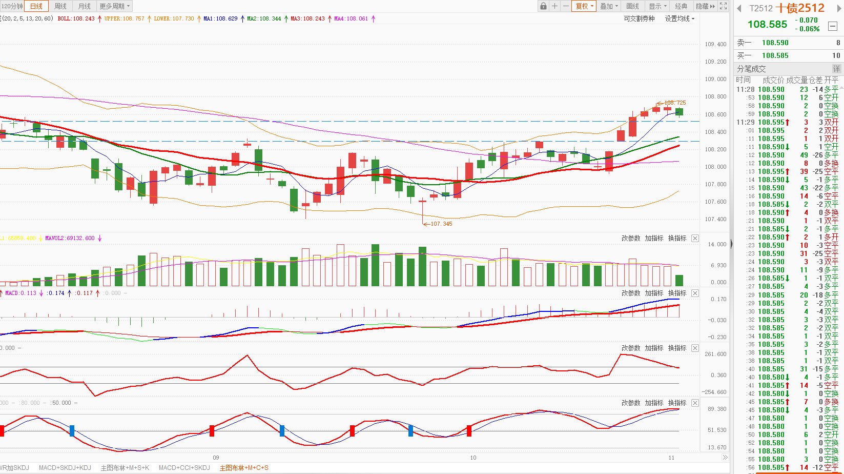 今天30年国债期货日K线收盘后在5日均线之上,2、5、10年国债期货日K线收盘后在5日均线之下,整体走势较差。