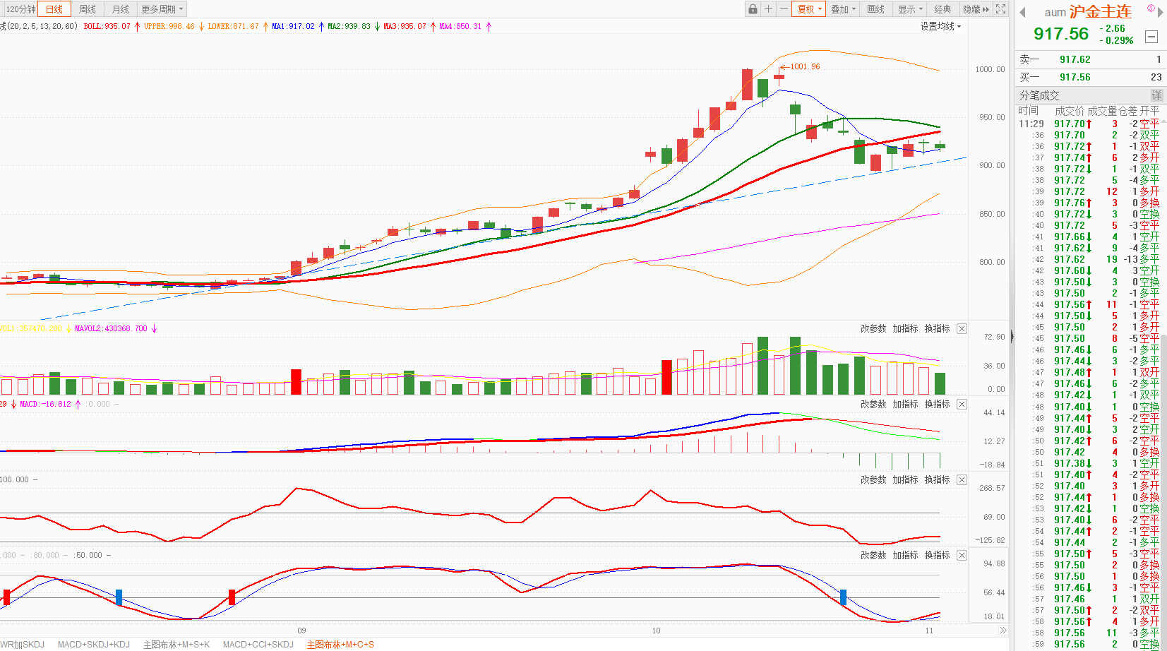 沪金主连:跌0.39%,日K线在5日均线之上。今天沪金下跌,日K线继续在5日均线附近震荡,目前处于横盘小幅震荡状态,打破平衡需一根大阳线或大阴线,后市关注上升趋势线的支撑和10、20日均线处压力。