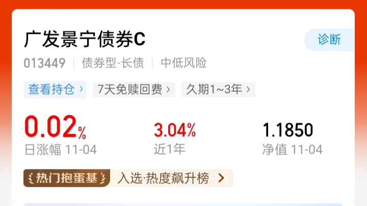 今天广发景宁债券C(013449)在大多数债基碎蛋的情况下收2蛋,已连续14天收蛋,表现太棒了!该基是一只稳定型纯信用债基,7天免赎回费。持仓以信用债为主,利率债占比很小,受利率波动影响小。