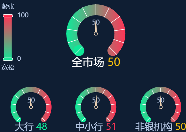 六、资金面情绪指数:全市场50 资金面紧平衡 (0-100紧张度递增,50为均衡,超过50反映资金紧张)
