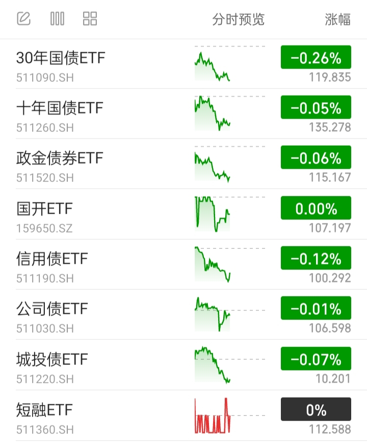 信用债ETF、公司债ETF、城投债ETF,代表信用债基。全部下跌