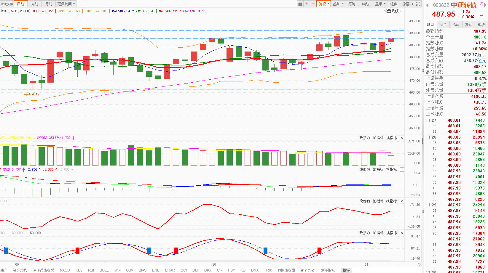 中证转债:涨0.36%,日K线在5日均线之上,KDJ刚刚金叉,MACD金叉红柱放大。今天中证转债上涨,日K线收小阳线接近前高,看这次能否继续向上突破。
