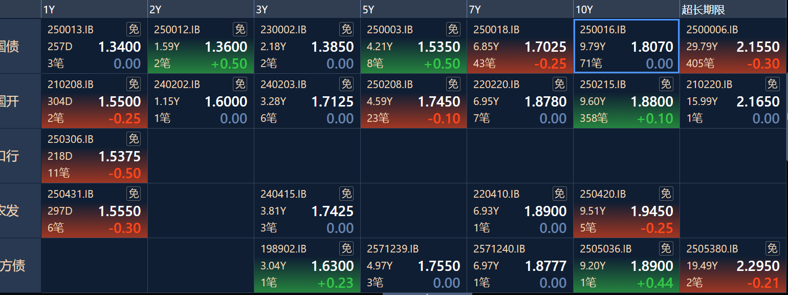 二、十年期国债收益率:1.807 0.0%(国债收益率越涨,债市越跌,两者反向关系)