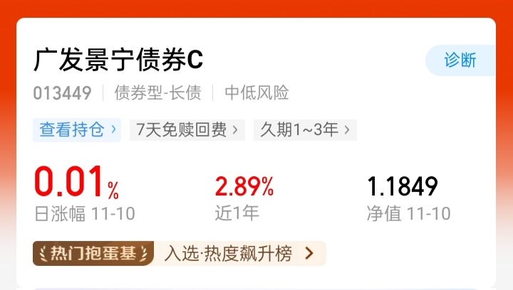 今天广发景宁债券C(013449)收1蛋,又开始收蛋了,此前曾连续15天收蛋!