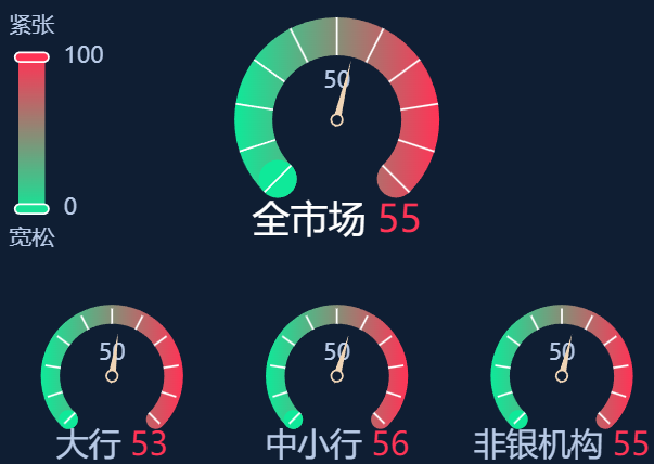 五、资金面情绪指数:全市场55 资金面趋紧 (0-100紧张度递增,50为均衡,超过50反映资金紧张)
