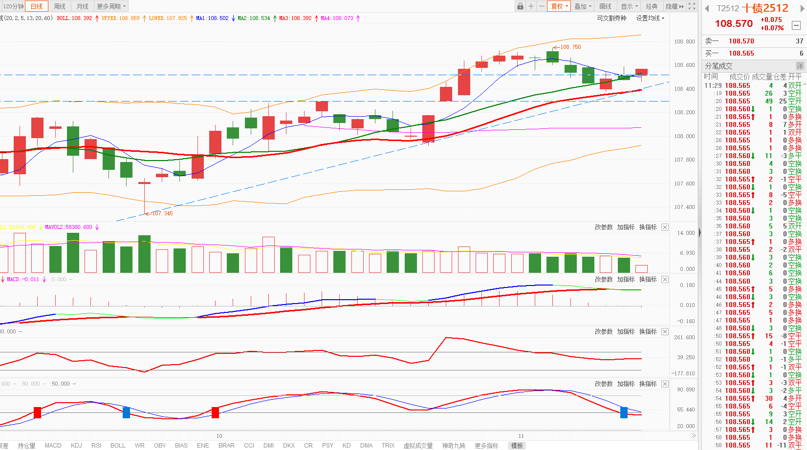 今天10年国债期货小幅高开后震荡上行,总体涨0.07%,日K线在5日均线之上。