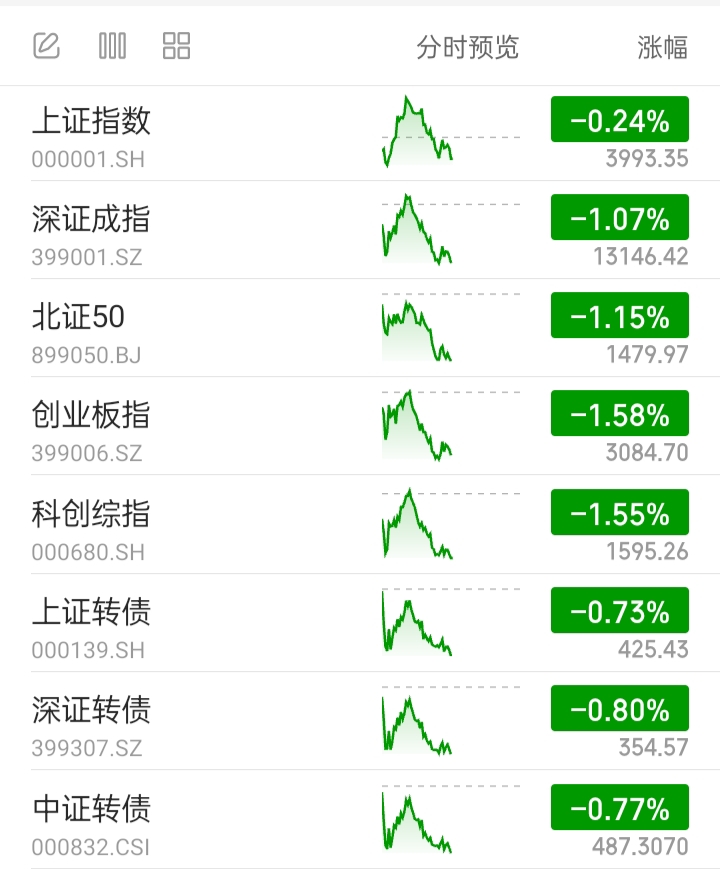 A股市场重要指数:全部下跌。今天偏股混基可能下跌。
