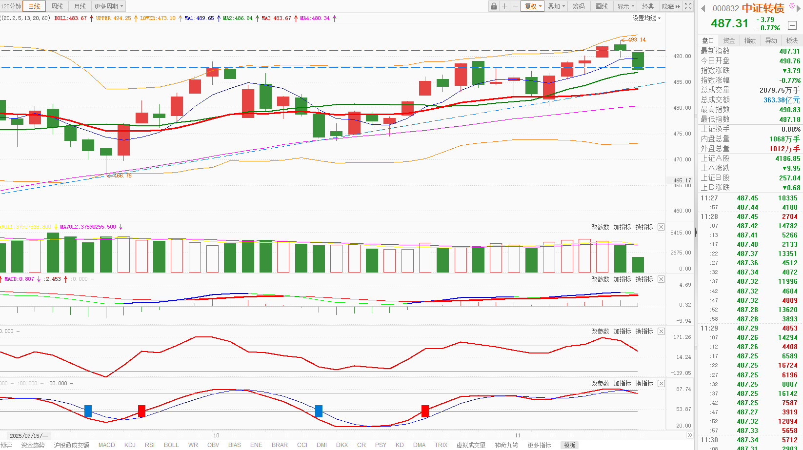 中证转债:跌0.77%,日K线在5日均线之下,KDJ死叉,MACD金叉红柱缩短。今天中证转债继续下跌,日K线跌破5日均线,短线进入震荡调整状态,有可能考验10均线,20日均线处应该有较强的支撑。前几天随司机减仓的小伙伴,后面可逢低适量买入。